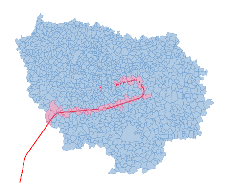 Un problème intéressant à partir d’une trajectoire d’un avion (que l’on peut récupérer par exemple par ADS-B) est de déterminer les communes qui voient leur territoire survolé par cette trajectoire. Ce calcul peut notamment servir à mesurer l’impact environnemental (émissions de polluants, impact sonore, etc.) du trafic aérien.