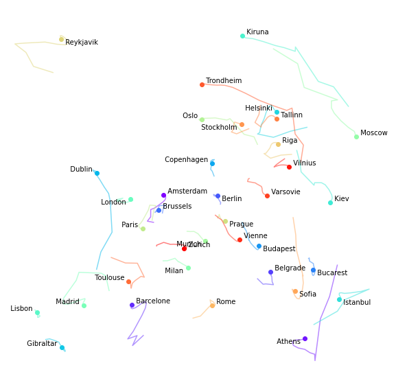 The BFGS algorithm seems to have found a solution. Setting the retall (return all) option to True allowed us to keep track of all the intermediate points the algorithm went throught (from $x_0$ to the optimal value of $x$). We shall call these points the convergence path and access them as solution[1] (as explained in the function’s documentation). We will use these points to plot the “trajectory” of the cities on the map along the iterations, from the initial guess $x_0$ to their optimal location.